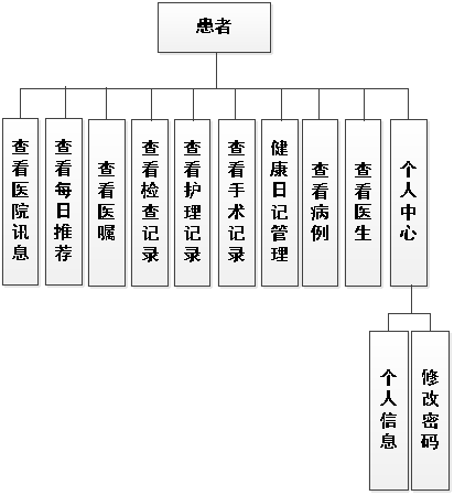 在前面分析的患者功能的基础上,进行接下来的设计工作,最终展示设计的患者结构图(见下图)。患者下载病例,查看医嘱,手术记录,检查记录,护理记录,登记健康日记信息。