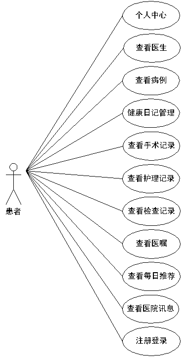 电子病历管理系统经过分析,确定了其需要设置患者的角色,其操作的功能通过用例图展示(见下图)。患者下载病例,查看医嘱,手术记录,检查记录,护理记录,登记健康日记信息。
