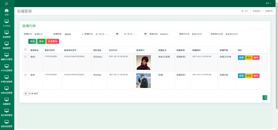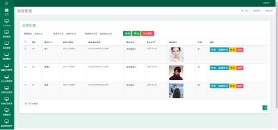 管理员进入指定功能操作区之后可以管理患者信息。其页面见下图。管理员增删改查患者信息,可以为患者的账户重置密码,可以通过患者的身份证号查询患者。