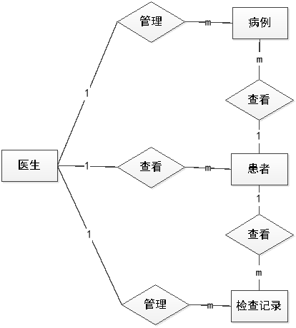 在前面分析的医生功能的基础上,进行接下来的设计工作,最终展示设计的医生结构图(见下图)。医生管理医嘱,管理患者的手术记录,检查记录,护理记录,管理患者的病例等信息。