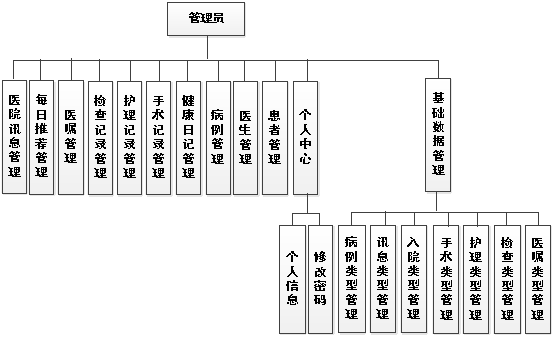在前面分析的管理员功能的基础上,进行接下来的设计工作,最终展示设计的管理员结构图(见下图)。管理员管理医生,患者,健康日记,手术记录,检查记录,护理记录以及医院讯息等信息。