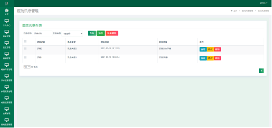 管理员进入指定功能操作区之后可以管理医院讯息。其页面见下图。管理员在本页面可以新增医院讯息,可以修改讯息名称,修改讯息详情信息,可以删除指定的医院讯息信息。