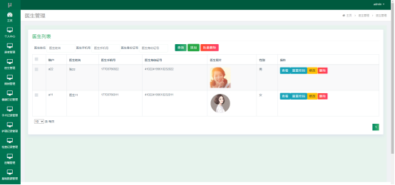 管理员进入指定功能操作区之后可以管理医生。其页面见下图。管理员可以增删改查医生的资料。可以为医生的账户重置密码。