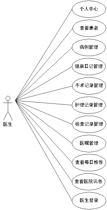 电子病历管理系统经过分析,确定了其需要设置医生的角色,其操作的功能通过用例图展示(见下图)。医生管理医嘱,管理患者的手术记录,检查记录,护理记录,管理患者的病例等信息。