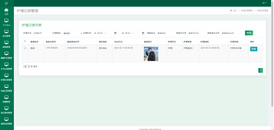 患者进入指定功能操作区之后可以查看护理记录信息。其页面见下图。患者在当前页面查询护理记录信息,点击查看按钮能够查看护理记录详情信息。