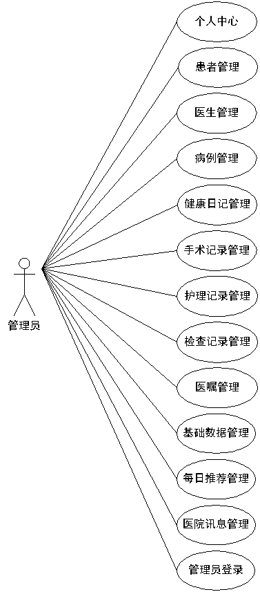 电子病历管理系统经过分析,确定了其需要设置管理员的角色,其操作的功能通过用例图展示(见下图)。管理员管理医生,患者,健康日记,手术记录,检查记录,护理记录以及医院讯息等信息。