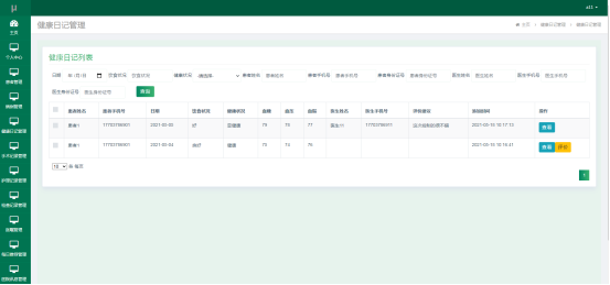 医生进入指定功能操作区之后可以管理健康日记信息。其页面见下图。医生查看患者的健康日记信息,评价患者的健康日记信息。