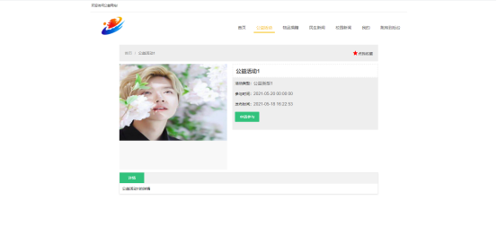 公益活动详情页面,在公益活动详情页面可以查看公益活动名字,公益活动图片,公益活动类型,公益活动参与时间,公益活动详情等内容,如图5-19所示。