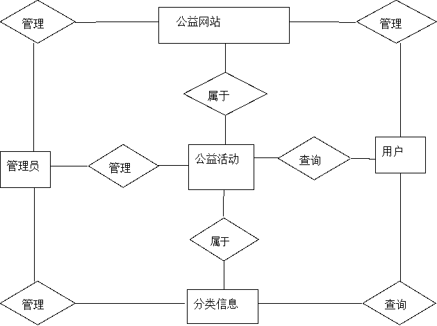 在分析并得出使用者对程序的功能要求时,就可以进行程序设计了。如图4.2展示的就是管理员功能结构图,管理员主要负责填充公益活动和其类别信息,并对已填充的数据进行维护,包括修改与删除,管理员也需要对志愿者,对物品捐赠,对新闻等进行管理。